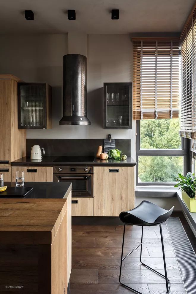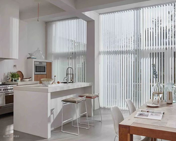 垂直百叶窗是带有全景窗户的厨房的美丽实用解决方案。