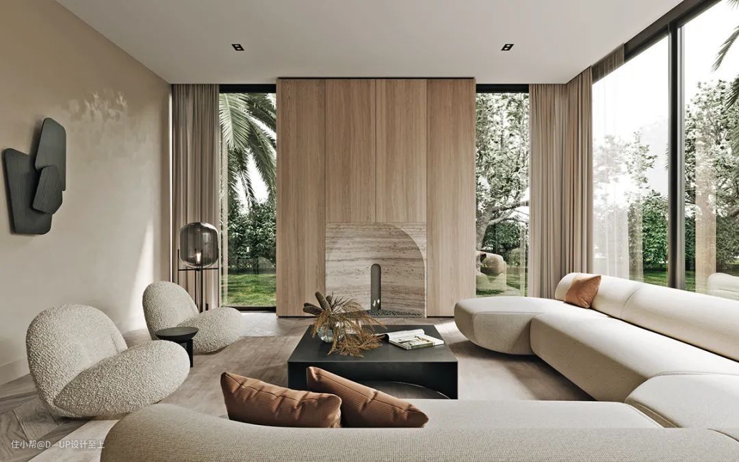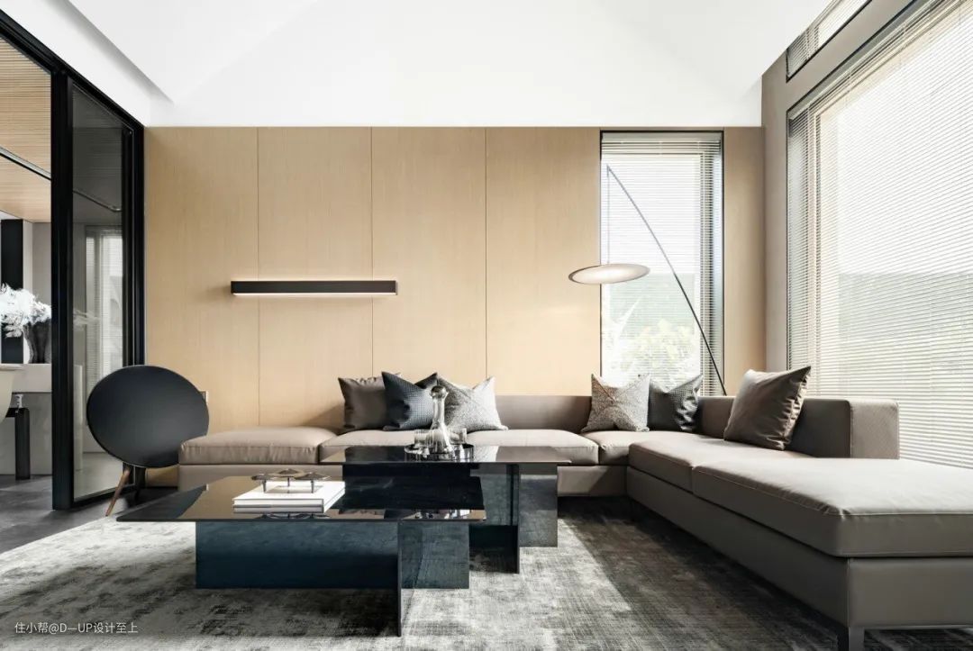 沙发背景墙与电视墙一样,也是一面比较重要的墙面。一般都是和电视背景墙做形式上的互补,如果电视背景墙选择了整墙木饰面装饰, 那么沙发背景墙就会选择局部木饰面装饰或留白,反之亦然。这样的处理可以避免全屋都被木饰面包裹的压抑感。