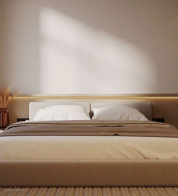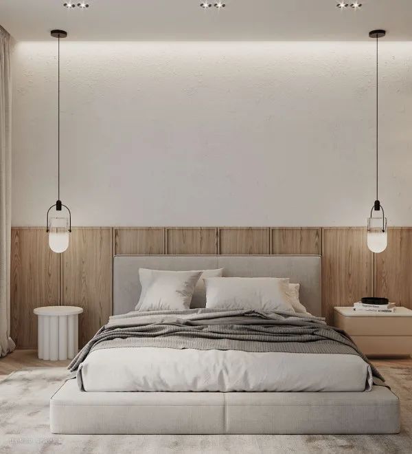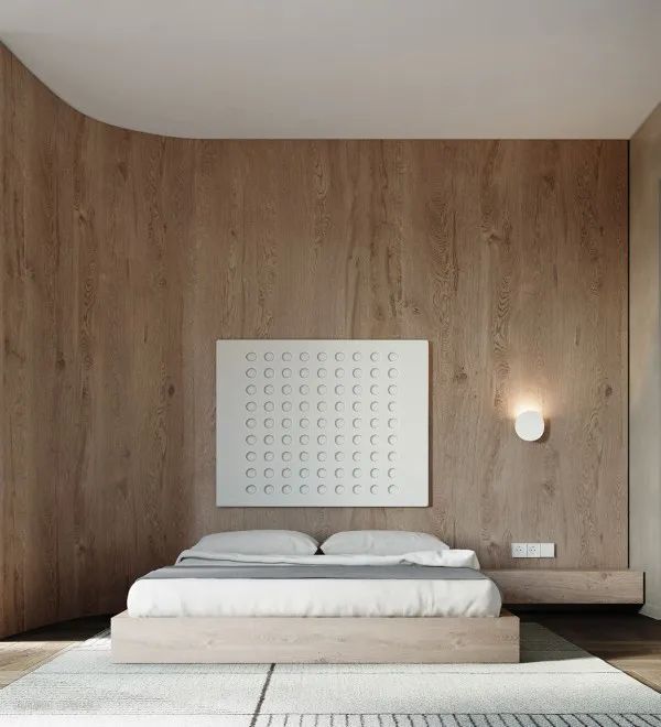 卧室是睡眠休息的空间,木质感的加入可以增加卧室空间的舒适与轻松气息,而且木质作为一种亲肤自然的材质,用作床头靠背的效果,也是非常不错。