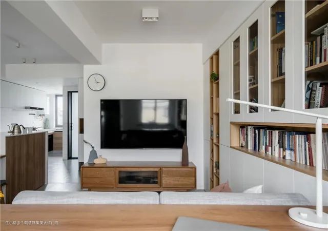 沙发另一侧,做了整面收纳柜,既为收纳,也是放置书籍的书架,可以将琐碎的东西都收纳起来,空间看上去也宽敞了许多,也让家更加的整齐有序。有简有繁,相比之下,电视墙就简单了许多,一张简单的电视矮柜,复古气息十足,电视上墙而置,不增添多余的装饰。