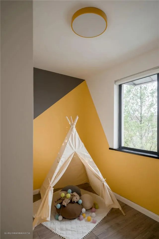 这个空间是为未来宝宝准备的儿童房,采用灰色+黄色作为主色调,营造了温馨的氛围的同时,又非常活泼。目前的儿童房除了定制衣柜,没有其它任何的家具,并提前预留出了榻榻米的位置,方便后期的使用。