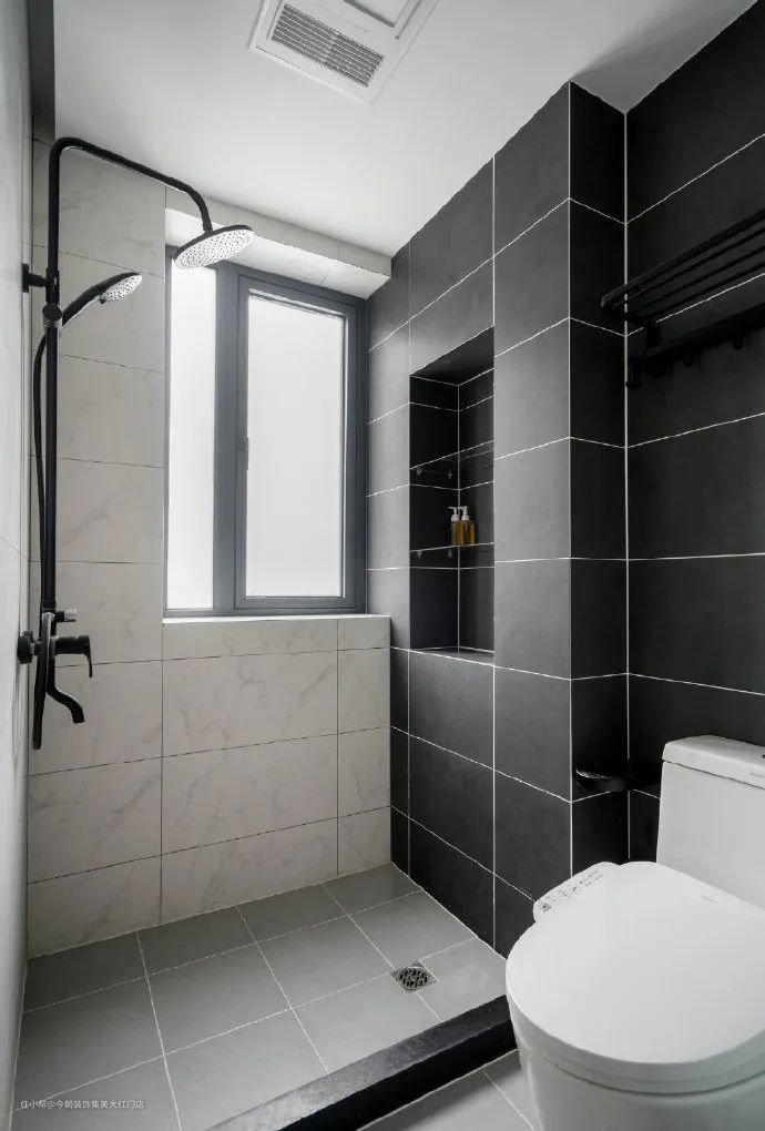 卫生间做了干湿分离,将洗手台外挪,里面是淋浴区和马桶区。干区整体采用了白色为主色调,明亮简洁,内部采用了黑白灰为主色调,百搭又耐看,在淋浴区做了壁龛的设计,美观又实用。