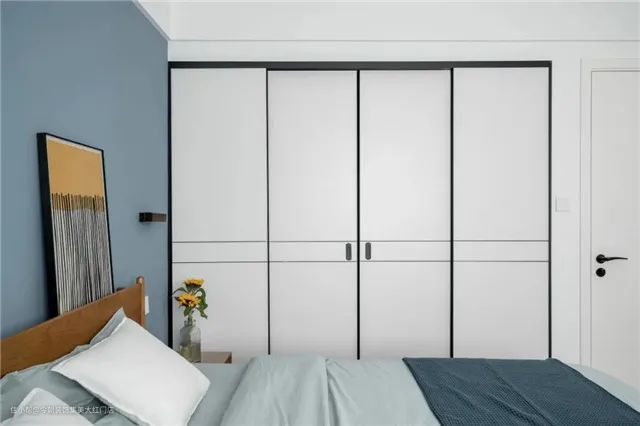 卧室内温馨舒适,用了素蓝色给人沉静之感,简单的床头灯,不过分装饰。床头雾霾蓝墙色特有的沉静,给以休息为主的卧室带来更舒服的视觉效果。通往卧室的走廊尽头有一幅色彩艳丽的装饰画,点亮了空间,而且还具有很强的视觉延伸感。床的一侧借用了做了一个U型的衣帽间,推拉门的设计不占用任何空间。