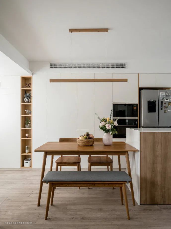 一进门,映入眼帘的就是餐厨区,餐桌与中岛紧邻,备餐用餐只在转身之间。餐厅是简约的原木风,一边是长条凳一边是单人椅,餐桌背后的墙面,做了一整面收纳墙,冰箱烤箱等大型电器都做了嵌入式的处理,让空间更加整洁。