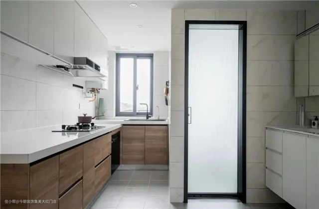 开放式厨房让整个空间变得更加开阔,“L”型橱柜布局,与空间和动线相匹配。另一边的是卫生间区域,做了磨砂玻璃门,透光但不透影。厨房的橱柜采用了上下分色的设计,更层次不显压抑。厨房旁边是卫生间,采用了干湿分区,利用率也得到了提高。