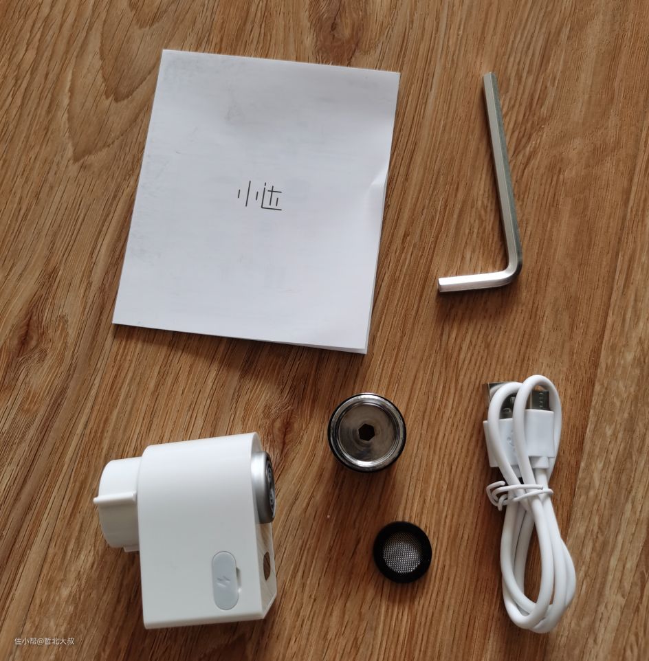 好了,有点跑题,今天新买的小米生态期下的小达感应节水器到了,先给大家看一下里边的包装,节水器主体、1个转换头、安装工具、说明书,基本上原始的接头和1个转换头就可以满足市场上99%的龙头了,但还是建议大家要是买的话,先问一下客服为好,别买了后安不上。1%也是大有人在的。