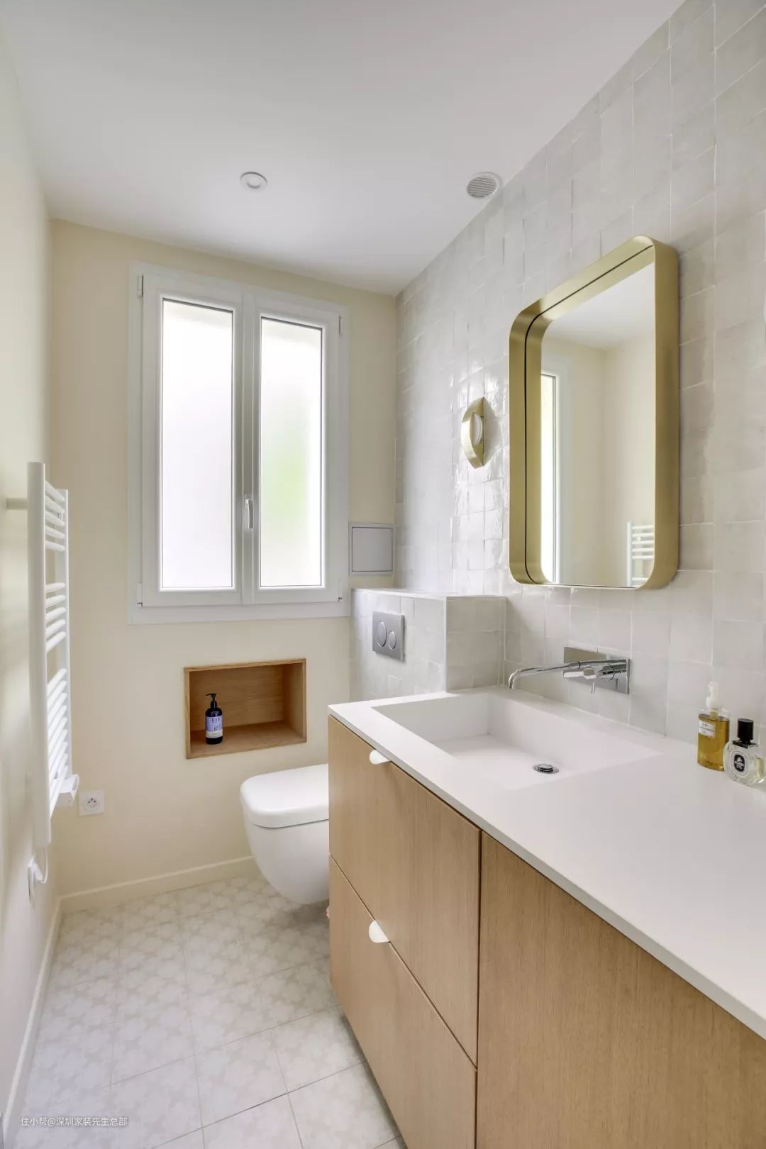 建立一面矮墙安装壁挂式马桶,你可以在台面上放一些东西,马桶旁边的壁龛可以放纸巾和香薰,墙面安装了电动毛巾架,可加快毛巾的干燥速度,保持卫生间干燥。
