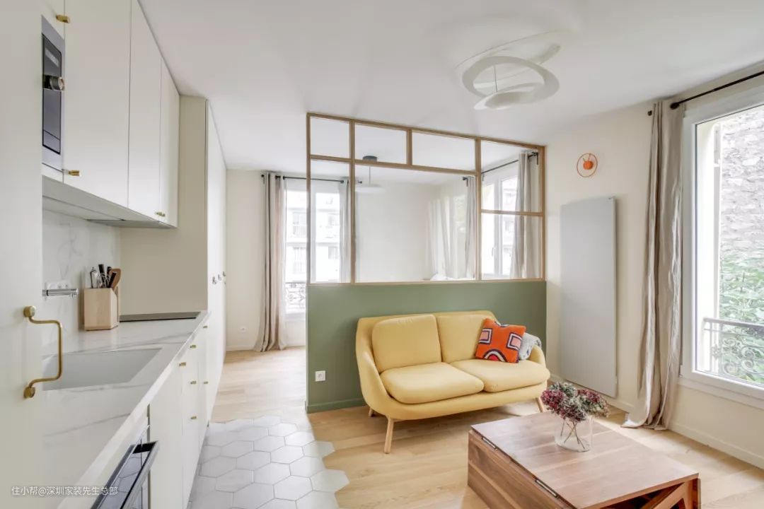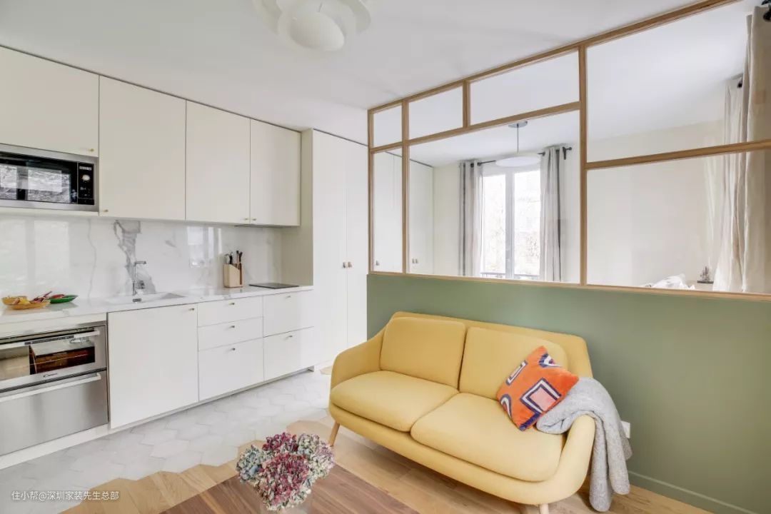 31㎡一字型小公寓,抹茶绿透明隔断,增加私密性,自然又温馨