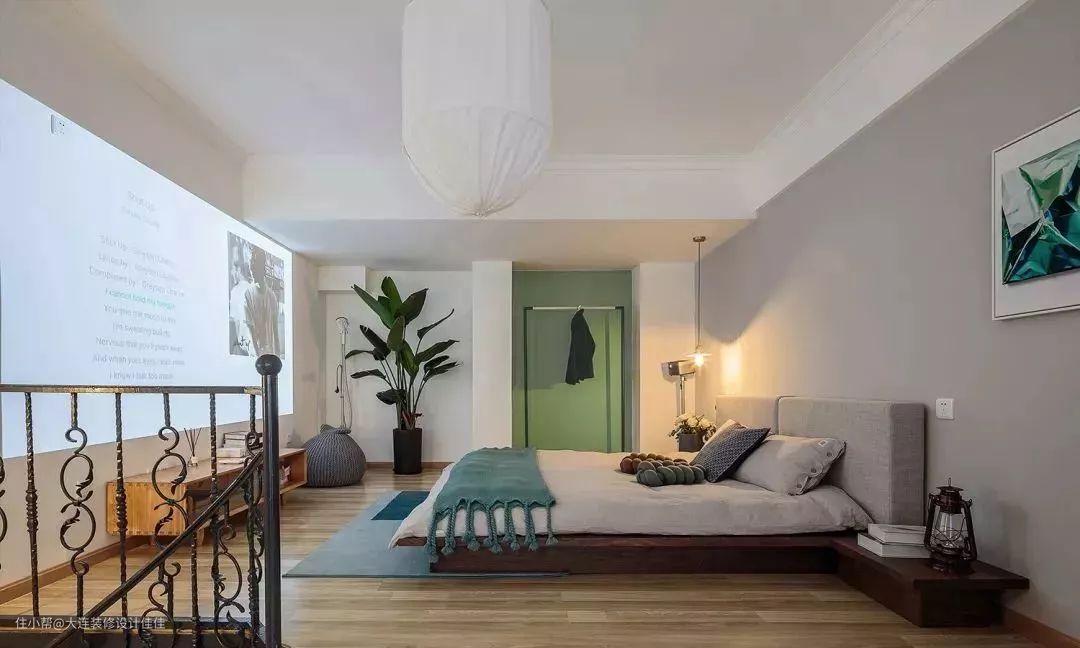 上楼后二楼是卧室空间,卧室床尾选择了留白搭配投影仪,可享受更好的观影效果,床边衣柜空间做了开敞式。