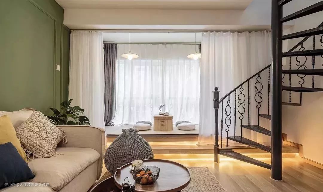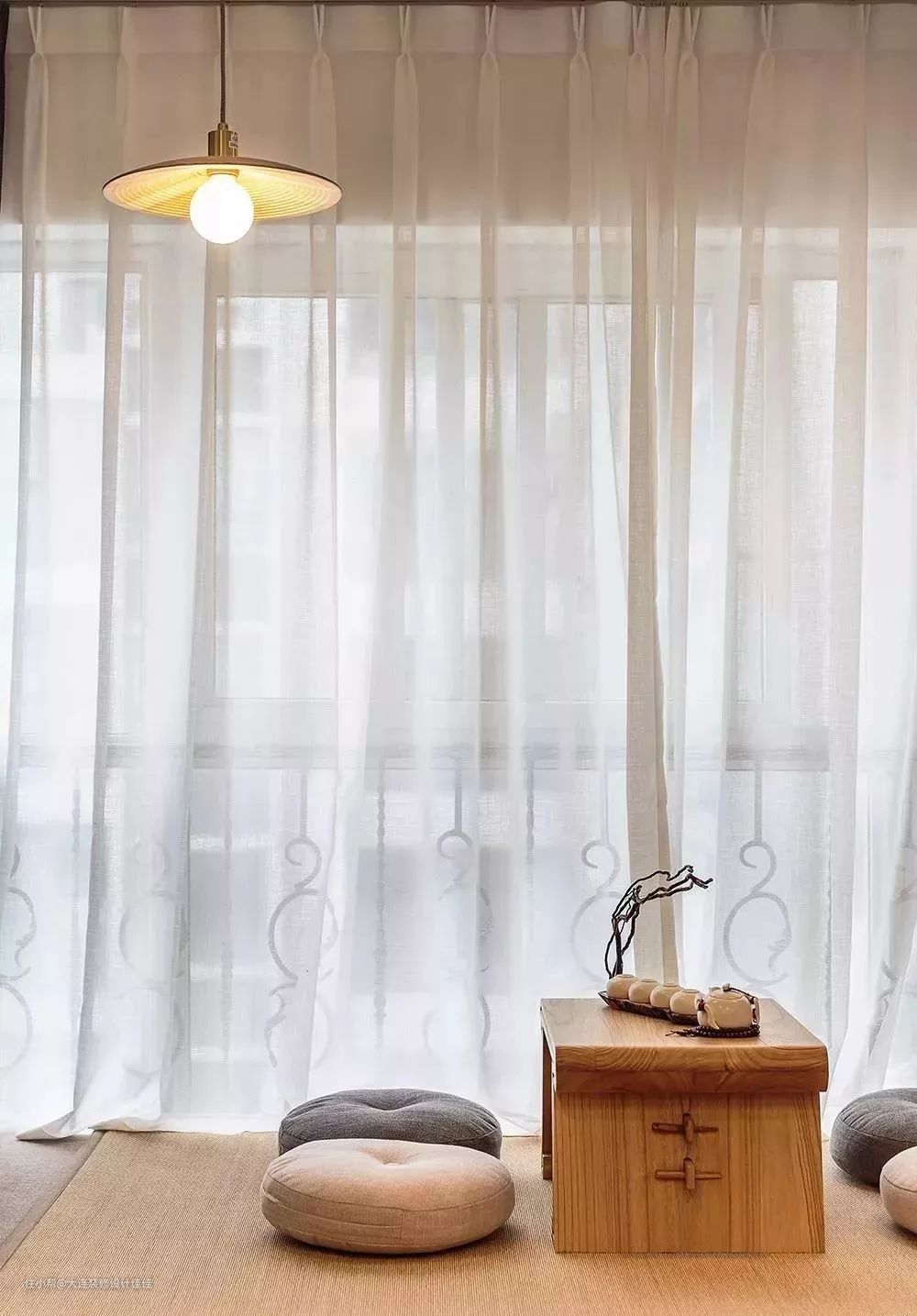 客厅边缘的阳台被用作休闲区,这里做上榻榻米地台,加上飘窗几个、蒲团和垫子,一边品茶聊天,一边欣赏窗外的美景。