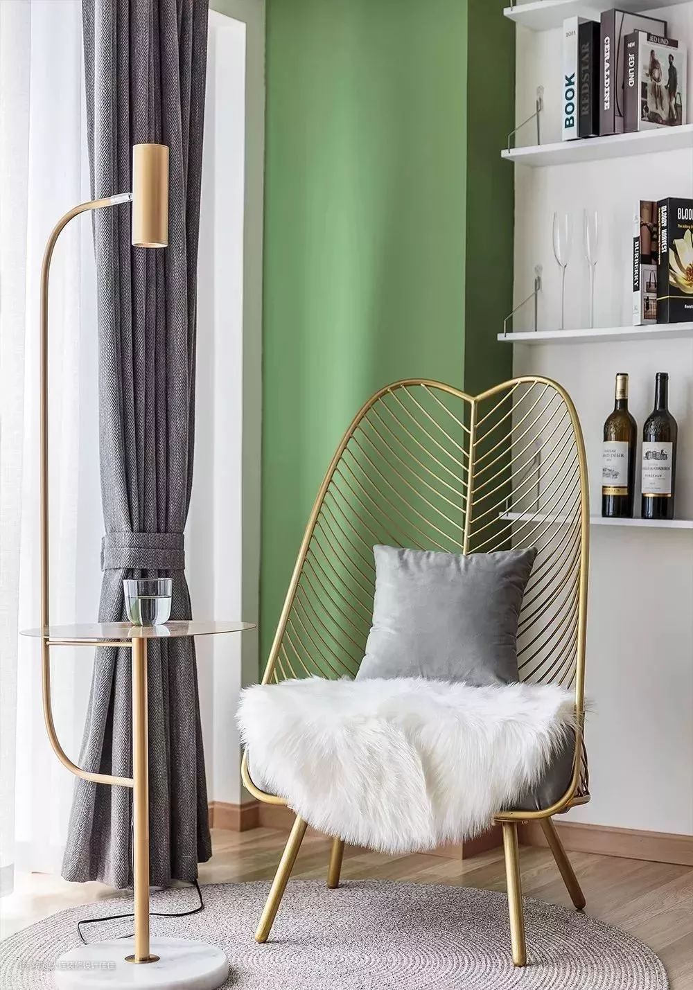 另一边的阳台也改为休闲区,铜制的椅子和落地灯适合喜欢轻奢风的房主,墙面做了多层隔板支架,满足收纳的需要。