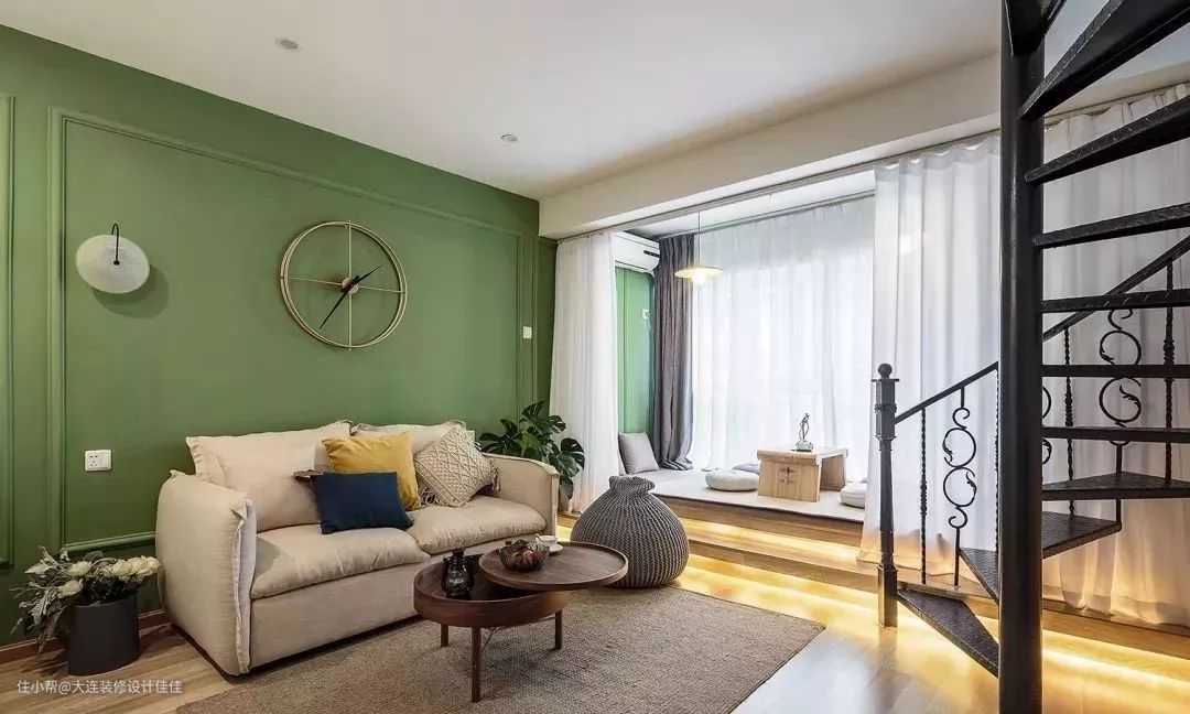 客厅沙发的背景墙被刷成了更加复古的绿色,加上石膏线边框线条和铜钟,让人觉得很有格调。浅绿色布艺沙发两侧的绿化,给客厅带来自然的感觉。