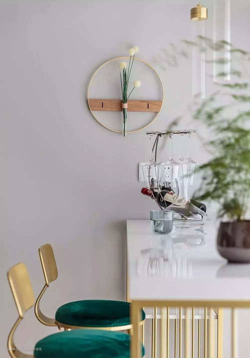 在第二层的阳台处做了一个时髦的小吧台,大理石和金属元素的结合带来了一种轻盈的奢华感,创意的墙面摆设和吊灯让吧台区更具情调。