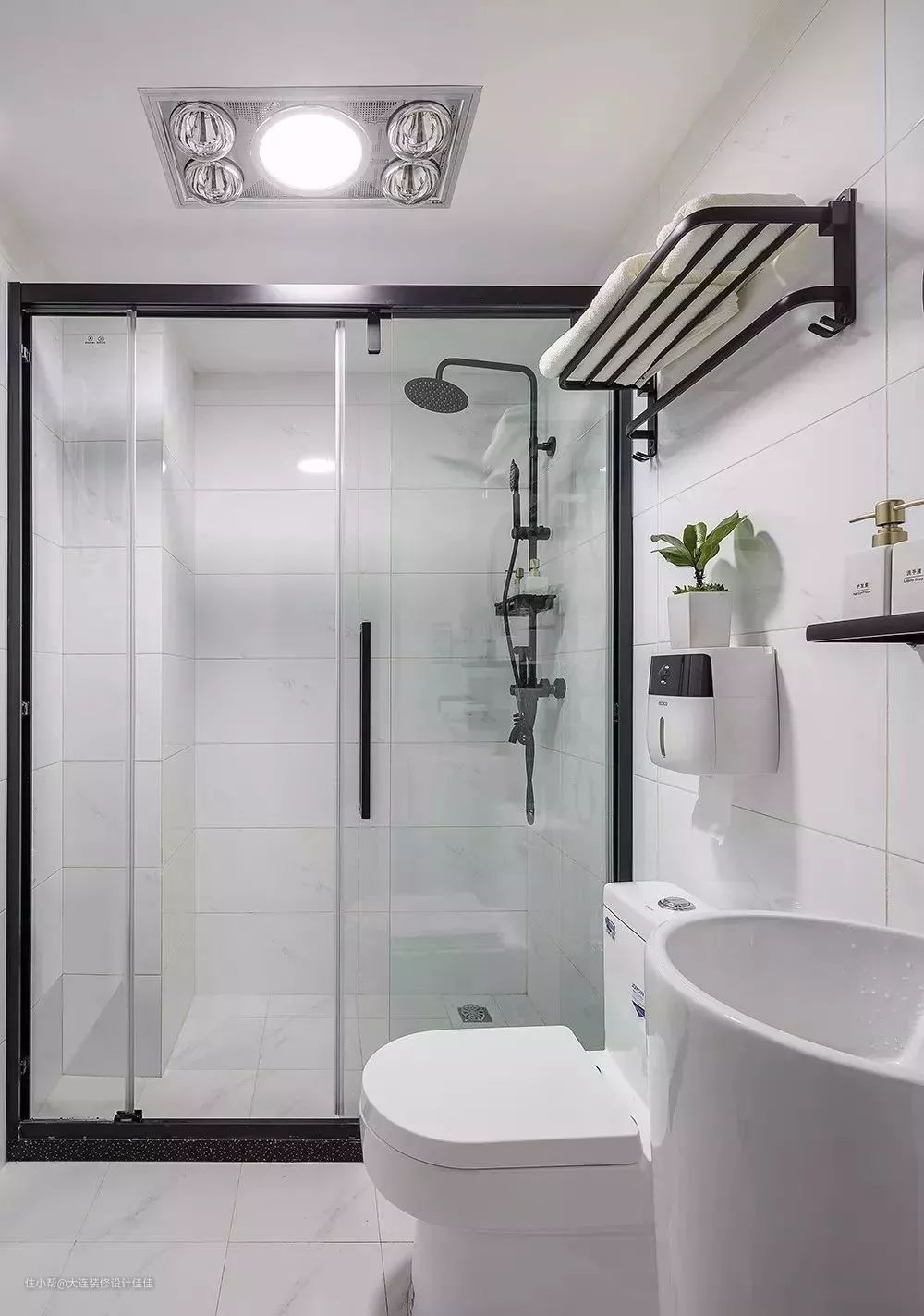 卫生间的内部是做了干湿分离的设计,整体以白色为主让人感觉更宽敞。在洗手台上、马桶上和淋浴房的拐角上都有收纳装置。