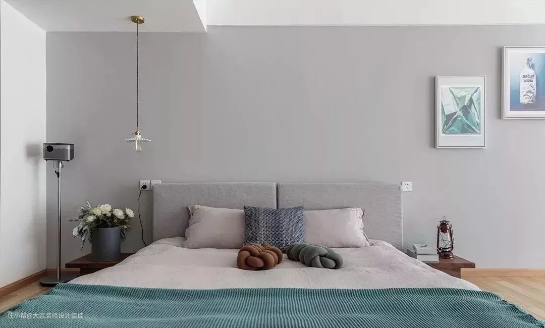 床头背景墙被刷成了灰色,大面积的留空避免了过于复杂,将一些挂画放在一边作为点缀,简单的床头柜上放置绿植和书籍。