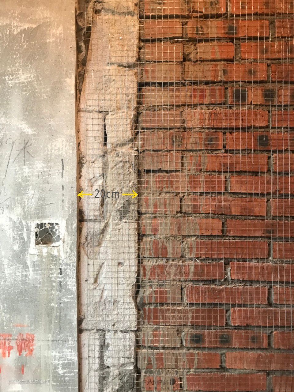 旧墙需要铲除20公分批荡(同样先切缝再铲除),先挂网再批荡,挂钢丝网要覆盖到旧墙20公分,新墙满挂网