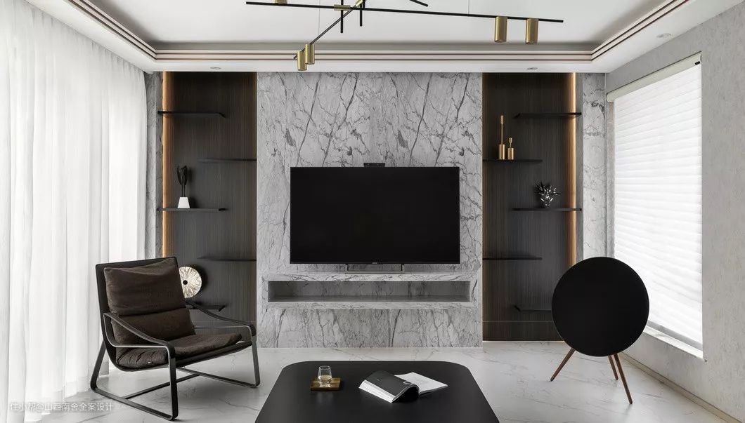 电视背景材质上选择了:中花白大理石+黑檀涂装板。值得一提的是电视背景的涂装板和大理石做了通高的处理,这样可以和吊顶之间形成一种自然的收口形式,给人更多的想象空间(常规的做法可能是材质压吊顶或者用其他材质进行收口处理)。