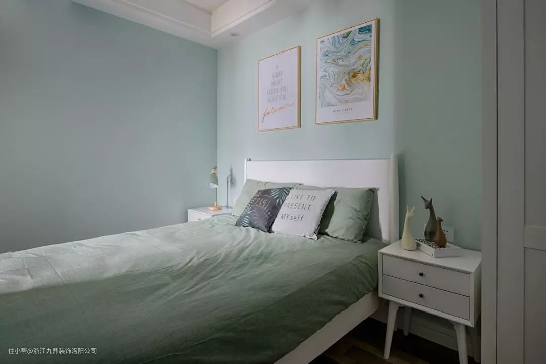 ▲ 儿童房,白色的床体和床头柜,搭配蓝绿色调的墙面和床品,整体给人以分外自然清新的氛围感,轻松安静又舒适。