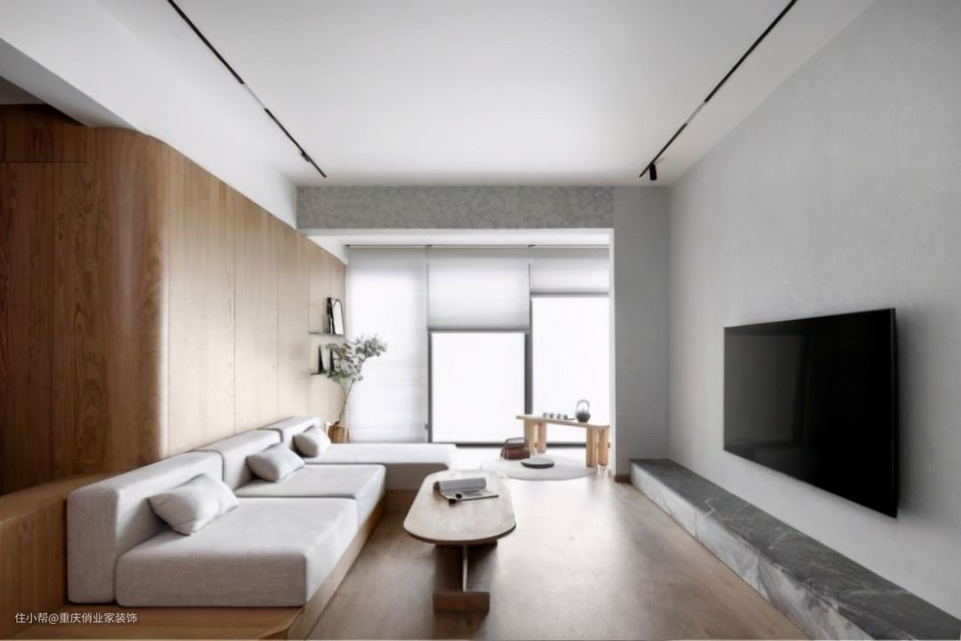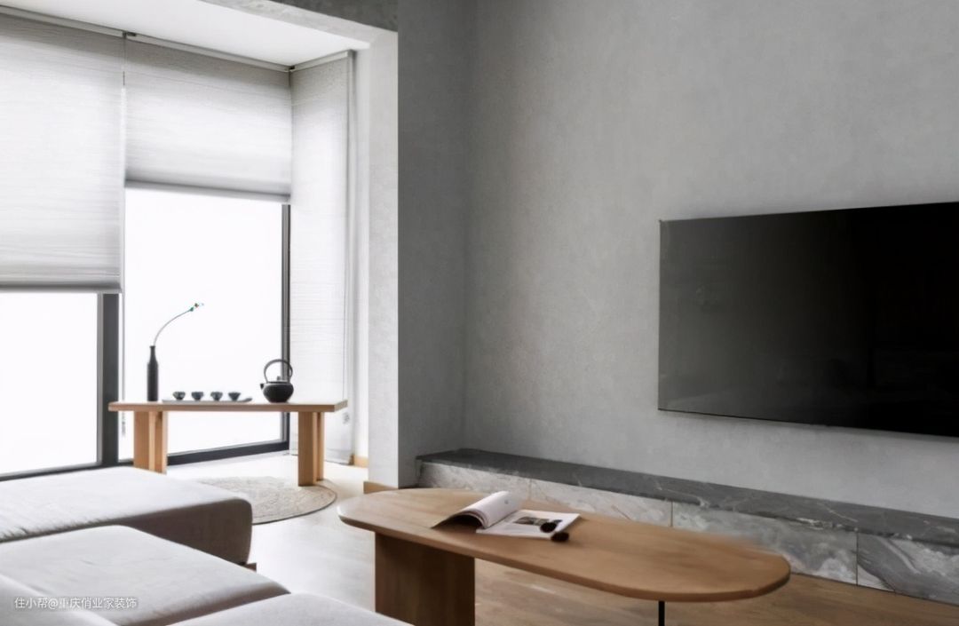 如果不想做吊顶,也不希望顶面增加造型,不妨大方“裸露”横梁,或许别有一番风味。例如,我们可以直接露出横梁,用水泥灰、质感漆做成类似浮世绘、海浪等纹路造型,这样一来,横梁反而变成了顶面的天然装饰物,缺点变优点!