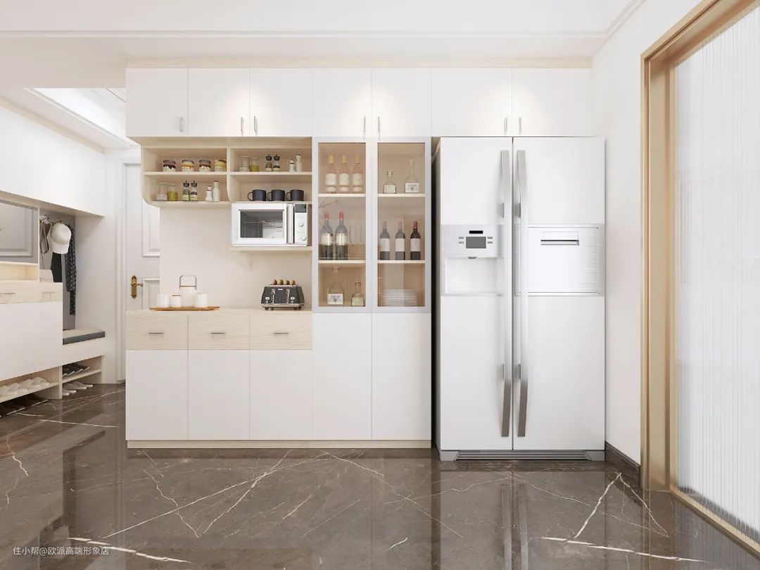 ④厨房灯光:吸顶灯/筒灯+吊柜下方灯线+柜体内部感应灯。