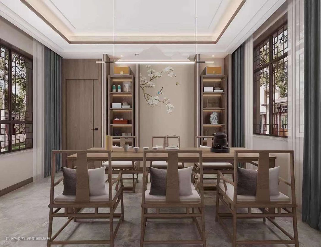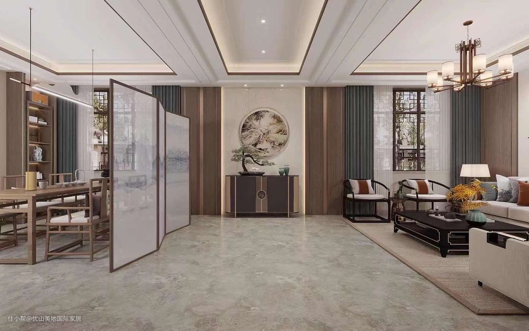 会客厅,半开放式的设计,中间用半透明屏风隔断区分客厅与茶室,斗柜上是“迎客松”了解中国古典空间设计的伙伴应该很了解寓意哦。这边我就不多说明了