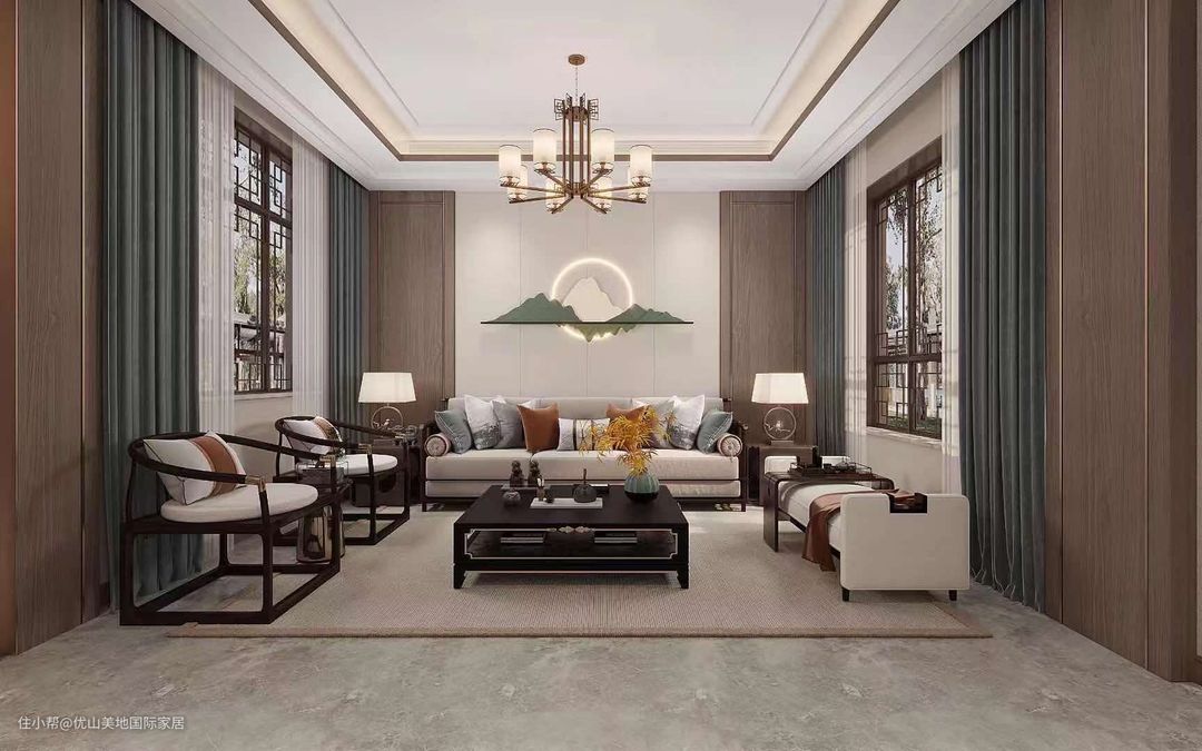 客厅,新中式风格的沙发配套庄重舒适,后背景远看是一轮朝阳从山间升起,圆环的一圈用亮灯设计明亮而有朝气。