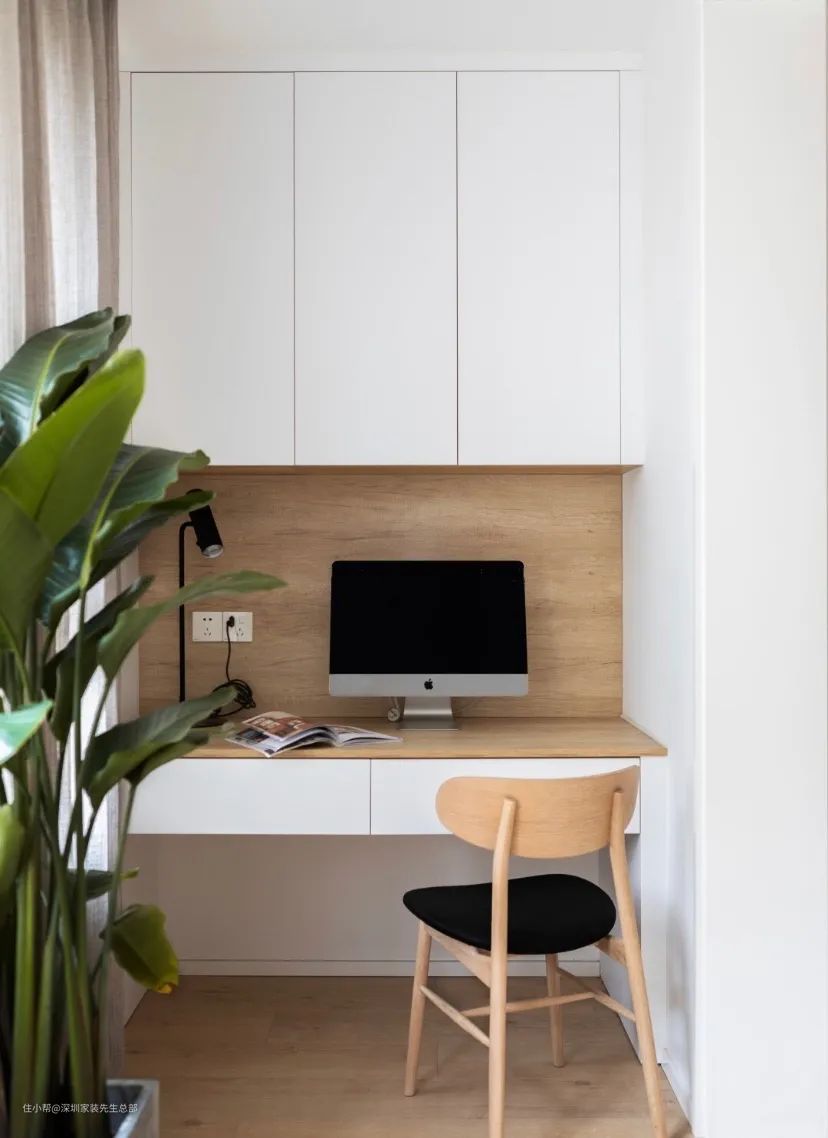 上层依旧做收纳柜,下层做书桌,预留好电源,就可以使用电脑啦~在家需要临时办公的时候,也更方便。