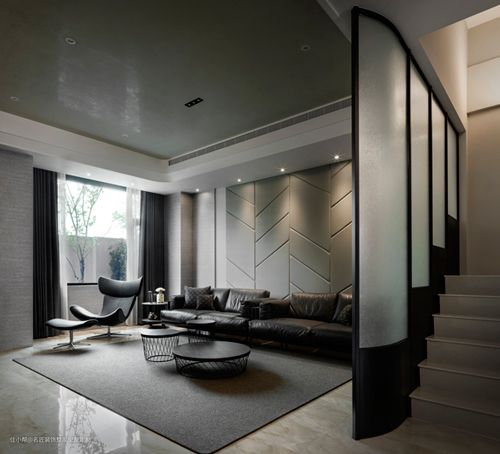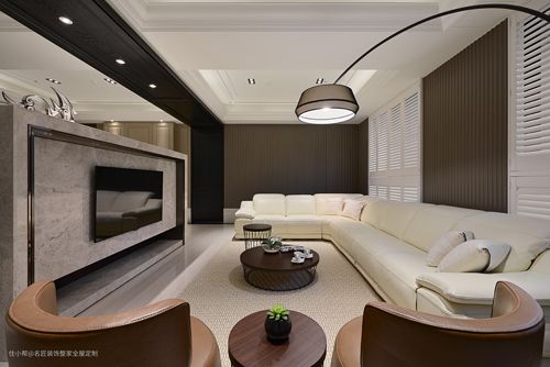 经多次讨论后选择运用两个模组,面对电视墙以V字型摆放,让客厅产生集中感,视觉效果更有层次。