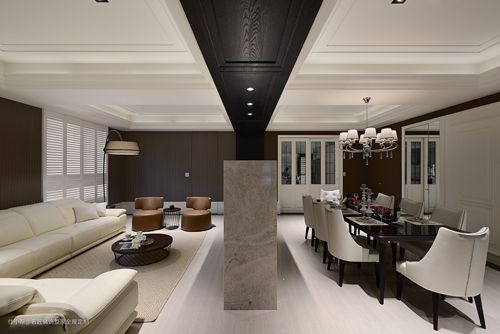 此案客厅装修设计风格古典中带有奢华感,在大空间客厅中想挑选一张能衬托客厅的沙发,几经挑选后选择集舒适与功能于一身的大L型沙发。