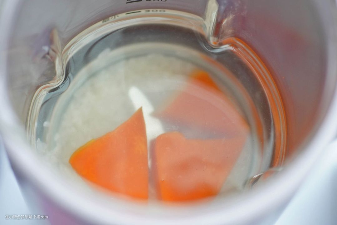 将大米淘洗两遍后,和切成小块的南瓜一起放入破壁机中。