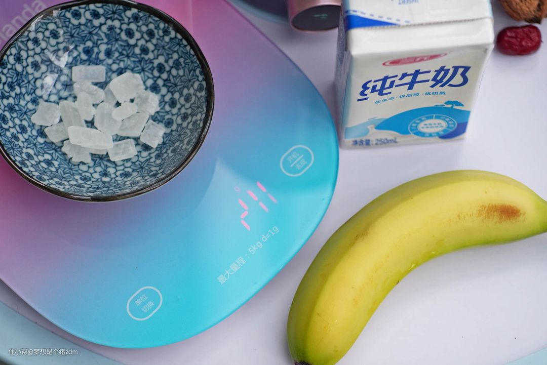 制作原料非常简单,一根香蕉、250ml纯牛奶、几颗冰糖。