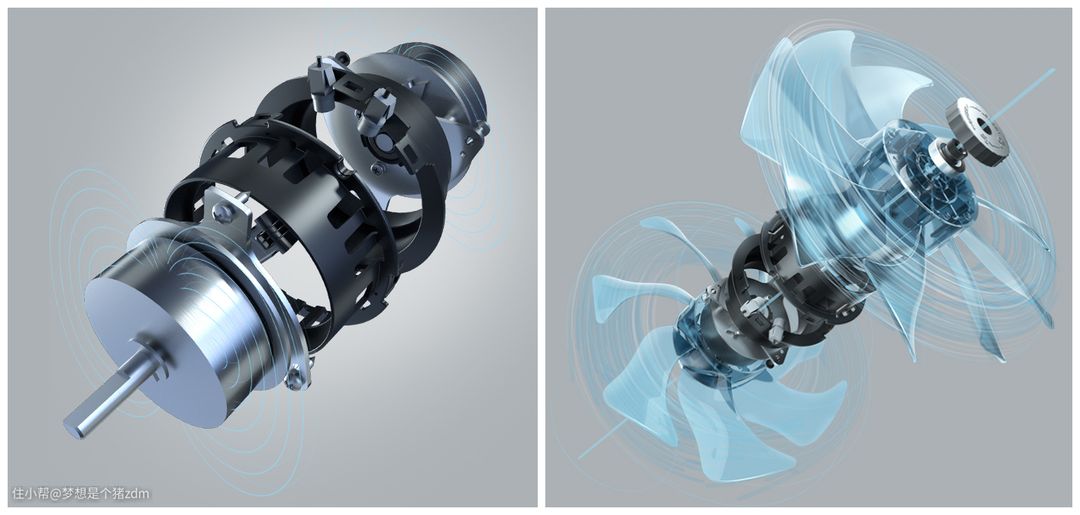 将这种设计借鉴到电扇上,于是就出现了这种对旋风扇。