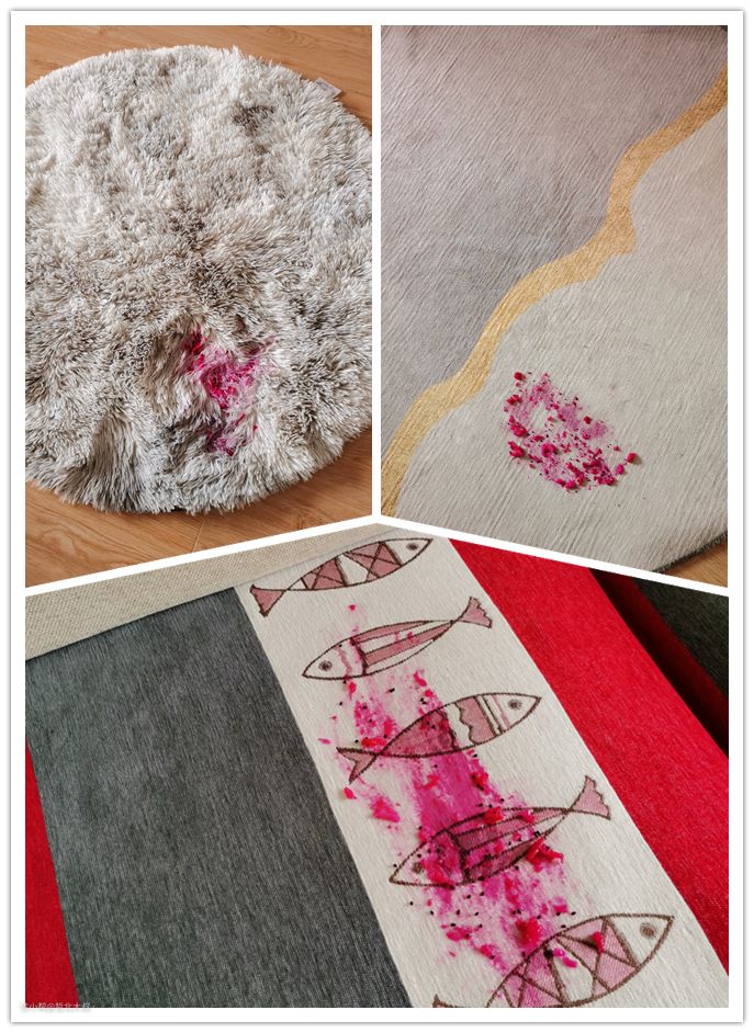 为了测试我新买了一个地毯,不是什么羊毛的哈,就是那种最便宜的,还但心能不能一下子给这地毯吸秃了。又买的红色的火龙果,这个颜色也明显,而且大家看着也直观,直接把火龙果抹在了地毯、还有我家的一个地垫上,还有沙发垫上,这要是清洗不干净,估计晚上就要和洗衣板过夜了。