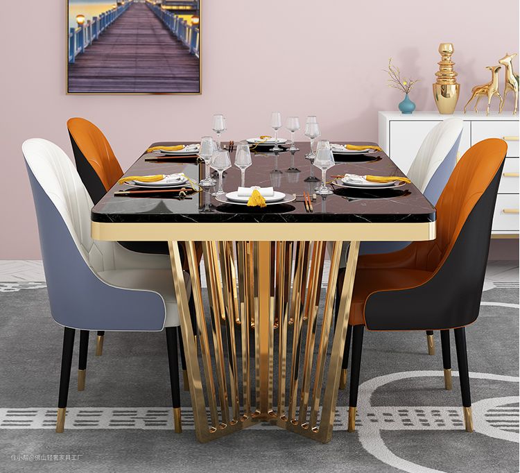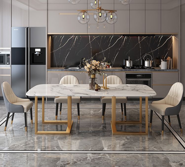 岩板台面餐桌比较轻盈,因为岩板厚度一般都比较薄,比如常见的岩板有3-12mm厚,相对其它材质来说非常薄,比较适合极简风格装修,岩板台面的优点是不渗色、防刮花、耐高温,缺点就是小贵。