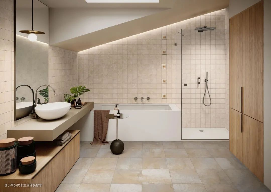 想要打造悬浮式卫生间,首先要做的就是将可能暴露在外的管道统统放进墙里,比如下水管、水龙头、花洒等。这样做的好处就是能够让卫生间看起来更加宽敞开阔,减少了卫生死角的存在,而且能让空间颜值提升一个档次。