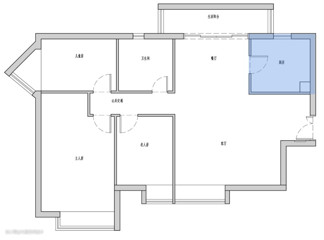 厨房区域在如图所示在这块燃气表在阳台,这个制约因素造成了整个餐厅窝在私密区域里面,所以在重新设计中,我们计划把厨房移到外面去。