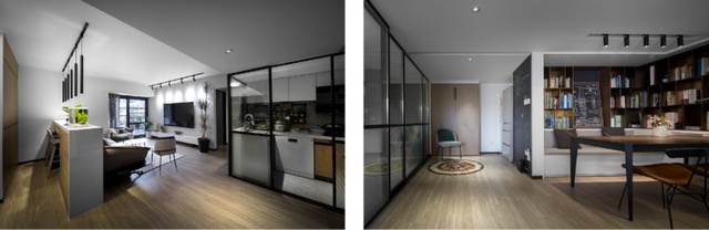 好处是颠覆了旧空间的狭小餐厅用餐区域,改造成餐厅、厨房跟客厅能连在一块的大空间。