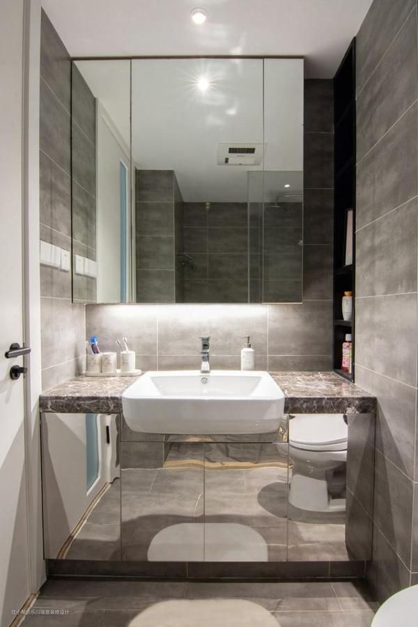 次卫经过改动面积大了不少,合理利用空间布置浴室柜、马桶和淋浴空间。台面深度不够,使用半嵌入式台盆。镜柜和壁龛设计,为次卫储物收纳提高保障。