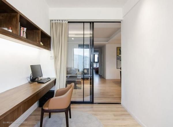 改动厨房进门方向,变成厨房与书房并排效果。玻璃推拉门设计,视觉效果整齐划一,空间通透不闭塞,还能提高居家互动效果。