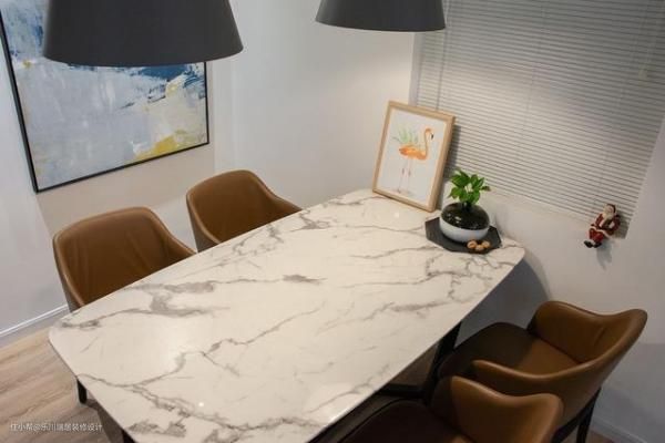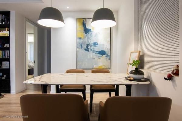 餐厅紧挨厨房,动线更加流畅。1.6m*0.9m 规格的大理石餐桌,简易实用好打理。餐厅背景墙选用一幅 1.5m*1m 的抽象画装饰,让空间不单调,煮饭的时候透过玻璃门也能欣赏一番。
