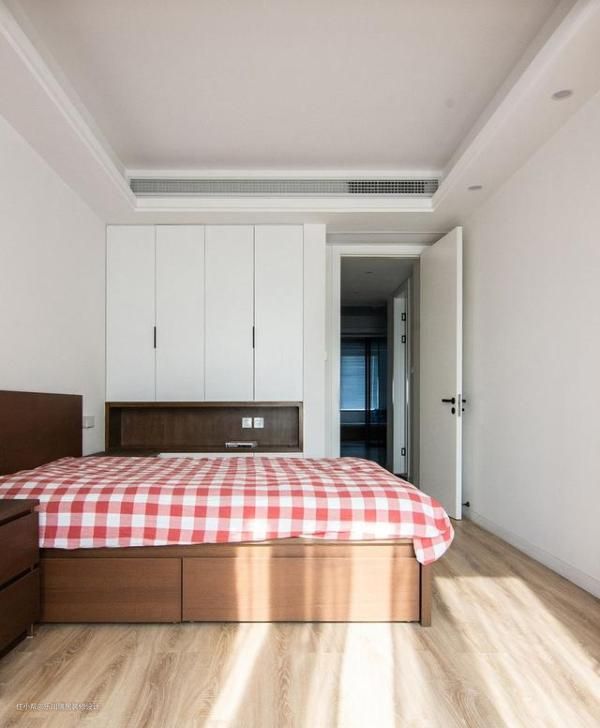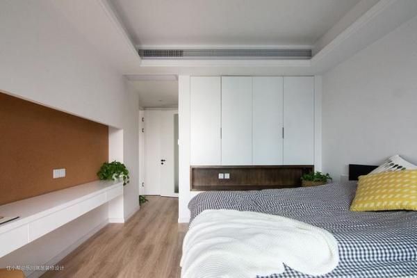 主卧延续了简约风格,原木白的色彩搭配,舒适温馨。衣柜设计有些与众不同,设计了开放式储物空间,用于摆放一些装饰品和书籍等。