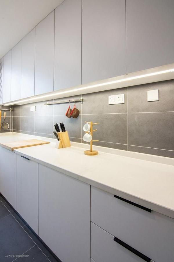 厨房电器区和备菜区,2.8 米长的操作台被合理划分,插座安装比较多,而且吊柜底部都做了隐藏照明设计,让厨房使用更加舒适便利。、