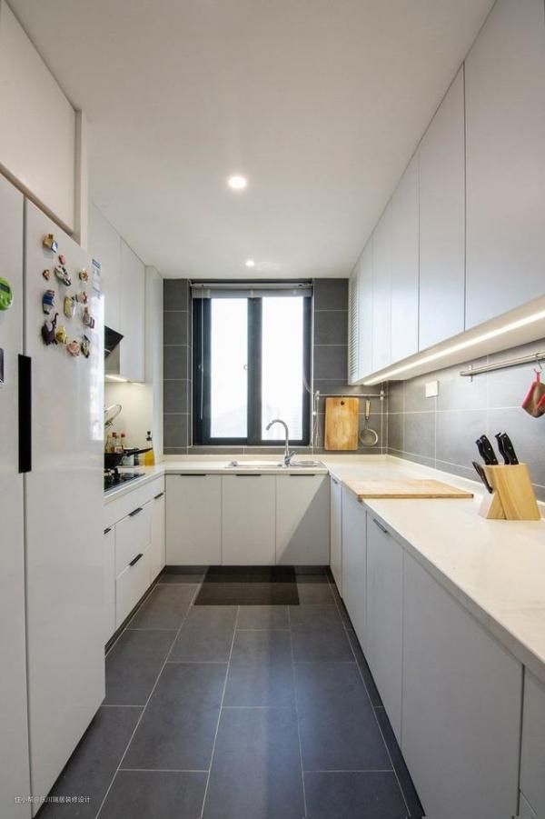 厨房明亮净洁,灰白色的碰撞简约高级。U 型设计,根据生活习惯依次布置冰箱、灶台、水槽等。
