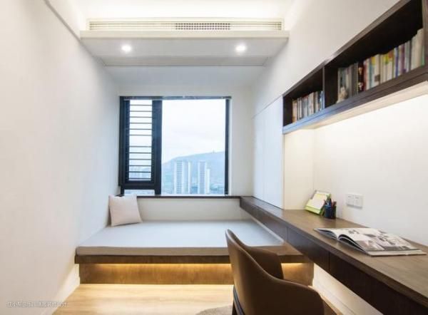 书房面积虽然不大,但空间感受还是不错的。简洁合理的设计,良好的照明,避免造成拥挤感。靠窗一侧设计收纳空间,柜门采用反弹器,弱化门的存在,保持空间整洁统一。