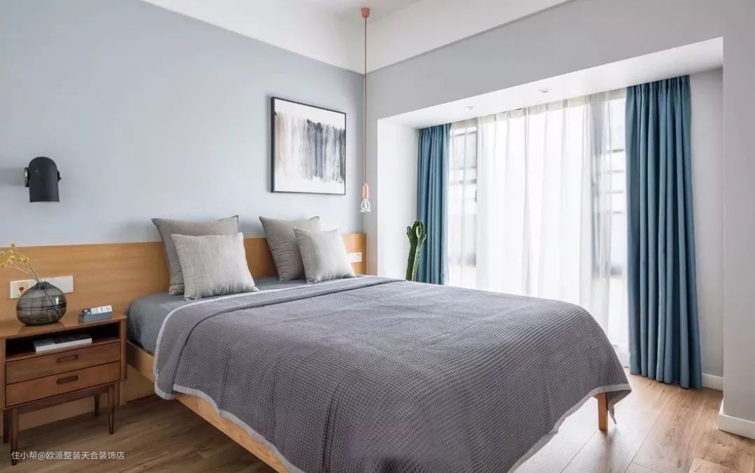 ▲ 卧室在延续客厅的风格上多了一些蓝色的感觉,家具也选择了偏暖的木质,增添温馨的感觉。