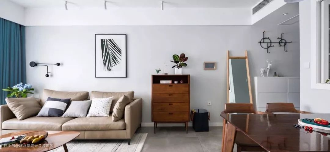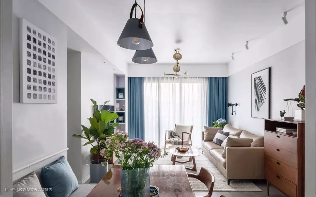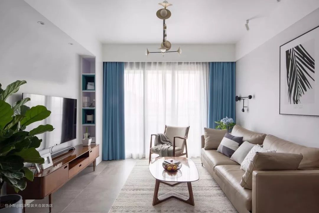▲ 客厅以灰白色为主调,蓝色的窗帘在这片平和与宁静中注入一股清凉的活力。