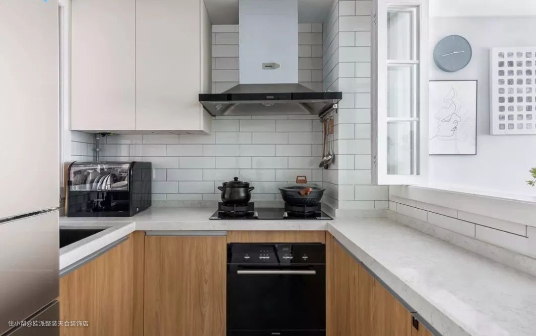 ▲ 厨房整体以白色为基底搭配木色橱柜,并借由内开窗引入光线,使空间更为干净明亮。