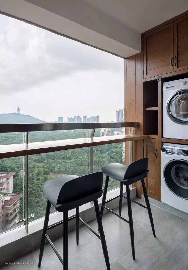 ▲ 阳台满铺防腐木,模糊了室内与室外的界限,并设计了超赞的吧台,让居住者能轻松的沉静在自然景观中。