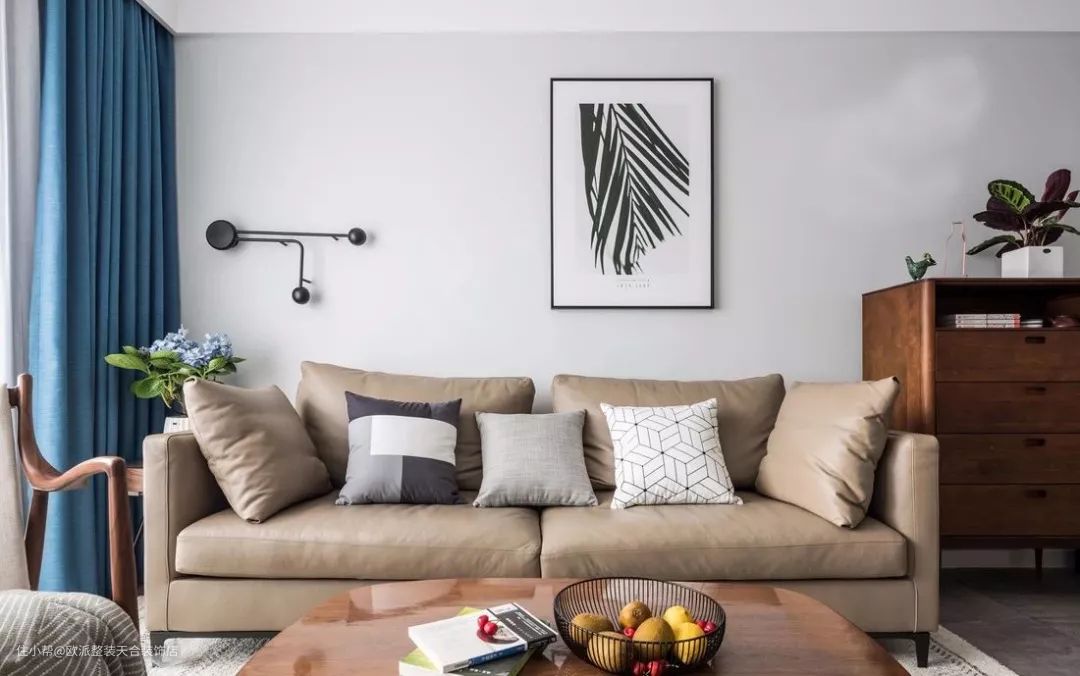 ▲ 坐感舒适的沙发上摆放几个抱枕,色彩对比下也是轻松自在。背景墙上装点一幅画,简单的线条与左侧的墙饰形成微妙的呼应。