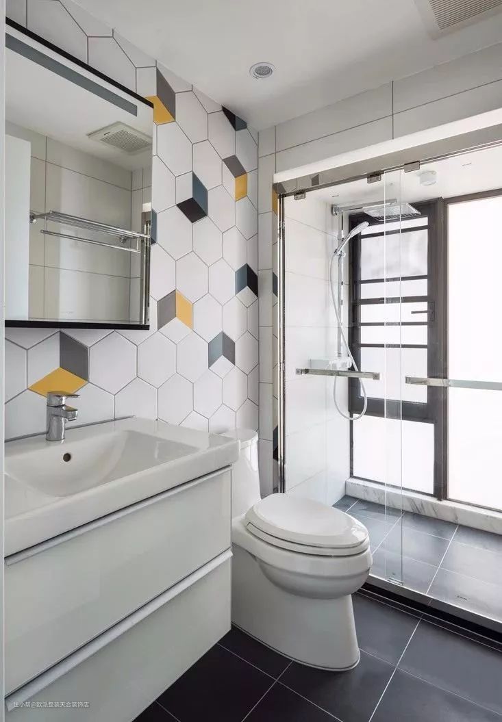 ▲ 卫生间黑白两色经典搭配,文艺六边砖中加入不规则的色彩点缀,瞬间丰富了许多。